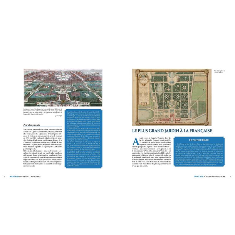 Louis XIV ne pouvait mieux honorer ses visiteurs de marque qu'en leur faisant visiter ce qui était sa plus grande fierté versaillaise : ses Jardins, haut et bas. Pour cela, il imposait un itinéraire précis défini dans la Manière de montrer les jardins de Versailles : il en existe plusieurs versions successives. Sur un parcours d'environ huit kilomètres, on suivra les vingt-trois paragraphes du texte de 1704, rédigé par un secrétaire et corrigé de la main du roi. Si le plan général, avec ses trois axes, défini par Le Nôtre restera inchangé, Hardouin- Mansart apportera à cette date plusieurs transformations à l'état primitif de l'intérieur des bosquets. Le lecteur découvrira donc les états successifs de ces salles de verdure, avant et après ces modifications. Complétés de photographies actuelles prises lors des grandes eaux, les documents d'époque (plans, peintures, gravures) permettront de faire revivre les ambiances anciennes.