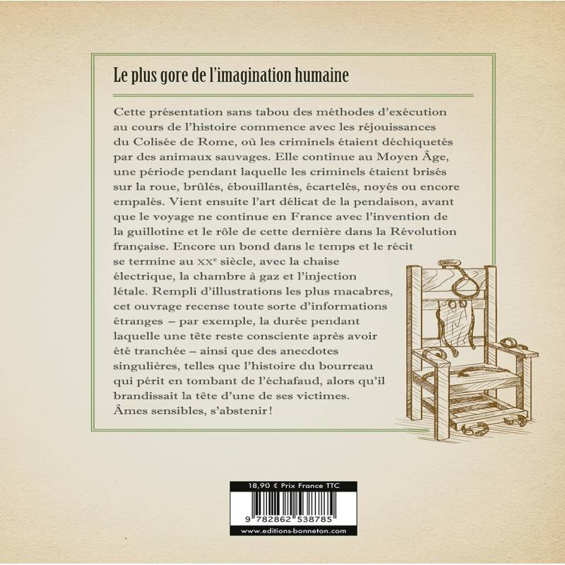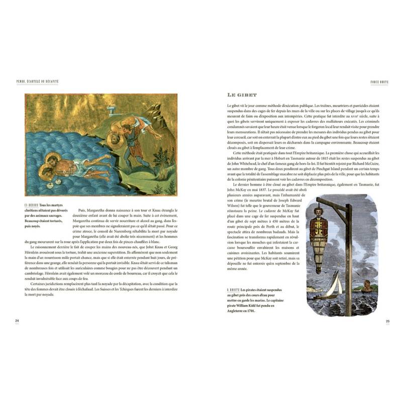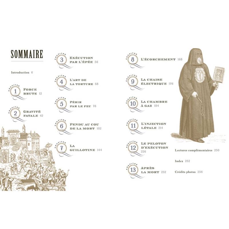 Rempli d'illustrations les plus macabres, cet ouvrage recense toute sorte d'informations étranges - par exemple, la durée pendant laquelle une tête reste consciente après avoir été tranchée ainsi que des anecdotes singulières, telles que l'histoire du bourreau qui périt en tombant de l'échafaud, alors qu'il bran