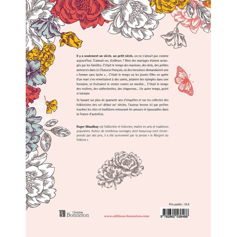 Il y a seulement un siècle, un petit siècle, on ne s'aimait pas comme aujourd'hui. S'aimait-on, d'ailleurs ? Bien des mariages étaient arrangés par les familles. C'était le temps des marieurs, des dots, des petites annonces dans Le Chasseur français, où des messieurs demandaient une « femme sans tache » C'était le temps où les jeunes filles en quête d'un mari s'en remettaient à des saints, jetaient des épingles dans une fontaine, se frottaient le ventre contre un menhir C'était le temps des rosières, des catherinettes, des chaperons Un autre temps, point si lointain.