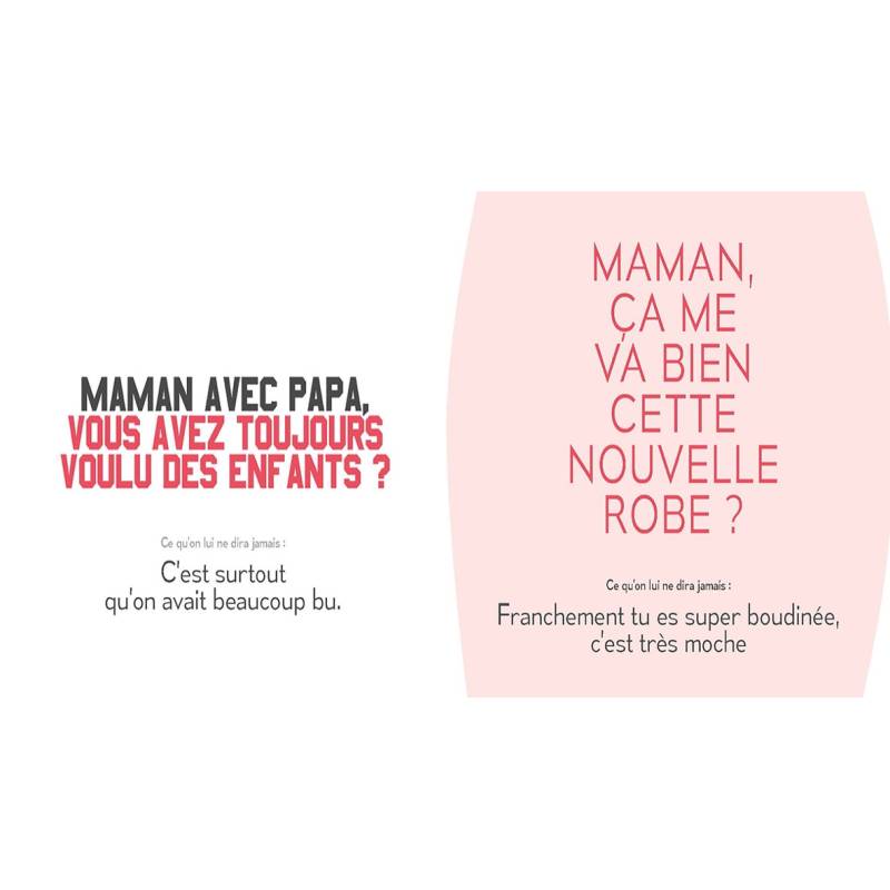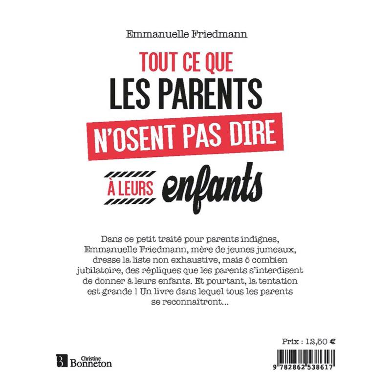 Dans ce petit traité pour parents indignes, Emmanuelle Friedman, mère de jeunes jumeaux, dresse la liste non exhaustive, mais ô combien jubilatoire, des répliques que les parents s'interdisent de donner à leurs enfants. Et pourtant, la tentation est grande ! Un livre dans lequel tous les parents se reconnaitront