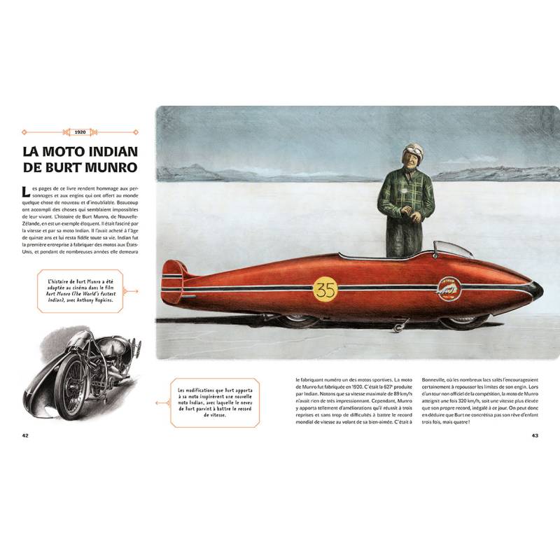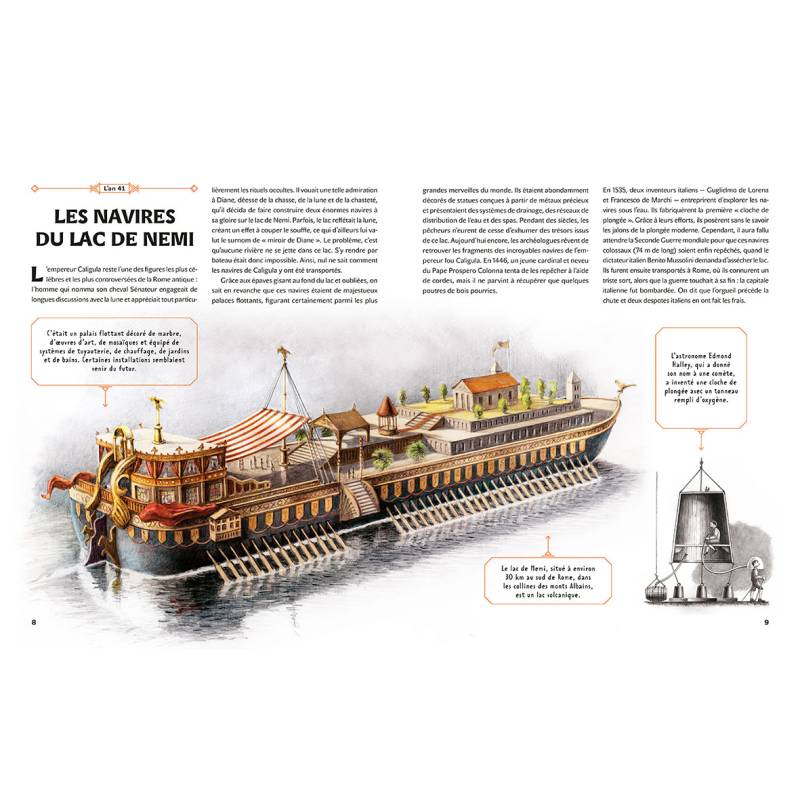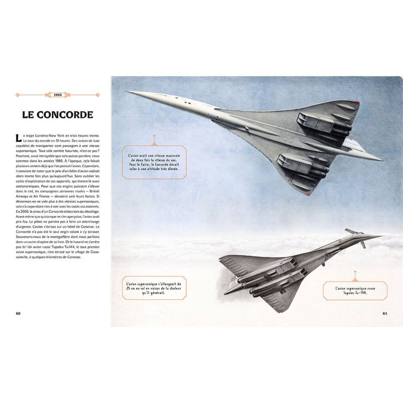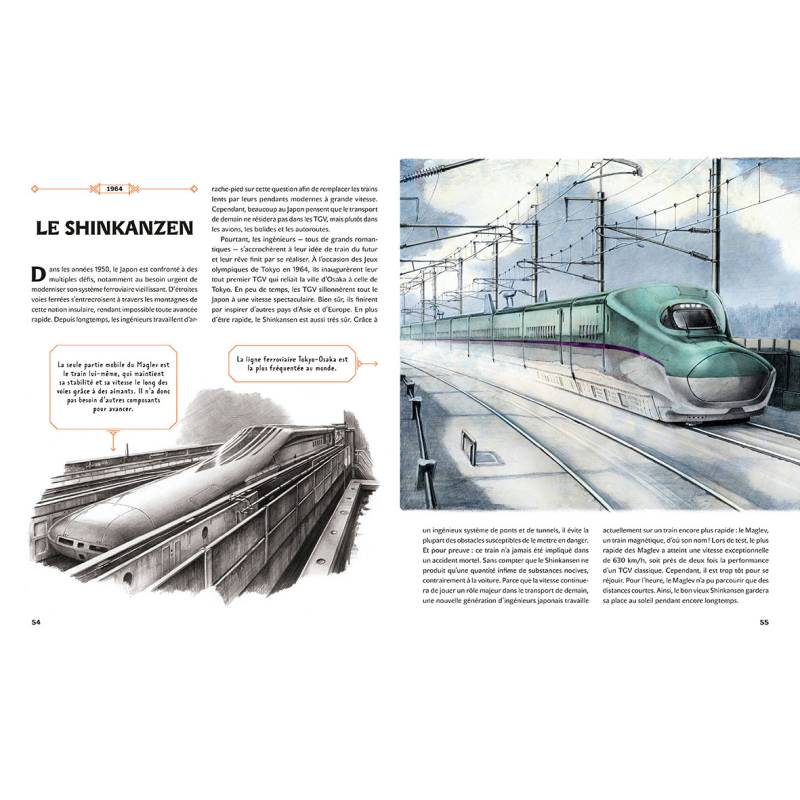 - Ce recueil illustré examine en détail les diverses innovations en matière de transport, depuis le IIIe siècle avant notre ère jusqu'à la navette spatiale Columbia en 1981 (joliment présenté sous forme de chronologie sur les pages de garde avant et arrière).